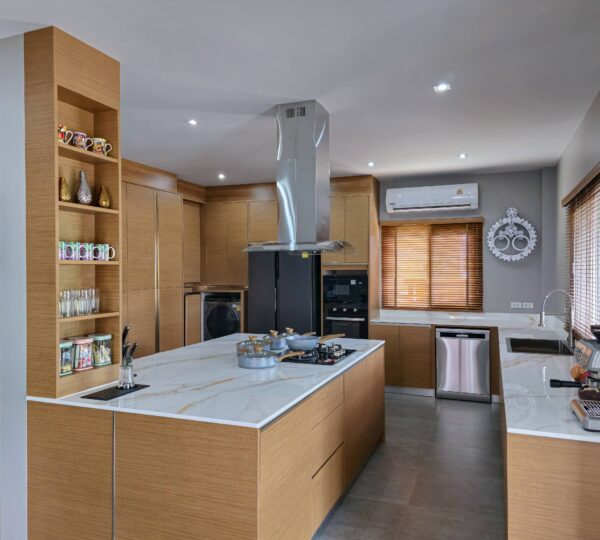 Modern kitchen with an island, high-end Hafele appliances, and all essentials for cooking and dining